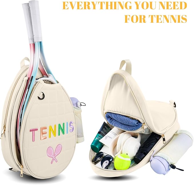 - Large Capacity: The compact tennis backpack can accommodate all your things without being too bulky. The main compartment can accommodate a pair of tennis rackets or pickleball rackets. Another accessory compartment can hold clothes, towels, mobile phones, wallets, keys, etc. The side mesh pocket is equipped with a cord lock for water bottles, umbrellas.